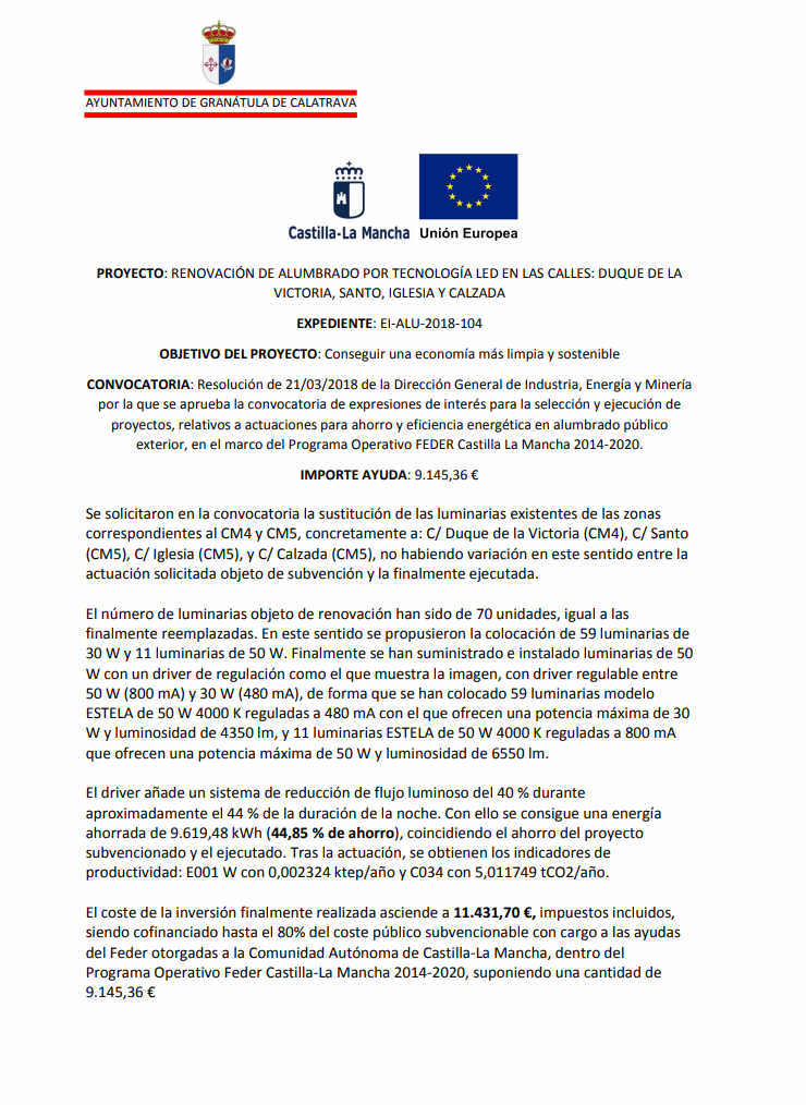 CONVOCATORIA: Resolución de 21/03/2018 de la Dirección General de Industria, Energía y Minería por la que se aprueba la convocatoria de expresiones de interés para la selección y ejecución de proyectos, relativos a actuaciones para ahorro y eficiencia energética en alumbrado público exterior, en el marco del Programa Operativo FEDER Castilla La Mancha 2014-2020.