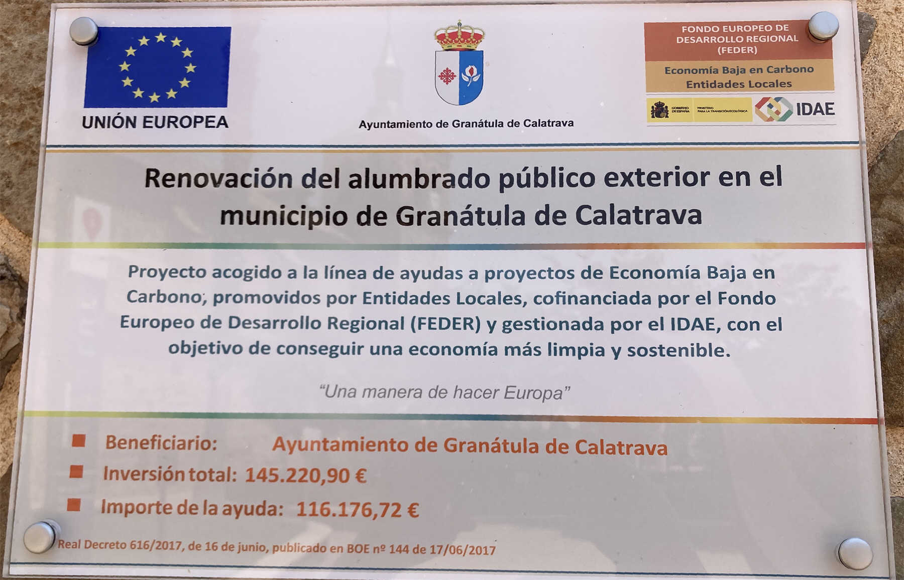 Proyecto acogido a la linea de ayudas a proyectos de Economía Baja en Cargono, promovidos por Entidades Locales, confinanciada por el Fondo Europeo de Desarrollo Regional (FEDER) y gestionada por el IDAE, con el objetivo de conseguir una economía más limpia y sostenible.