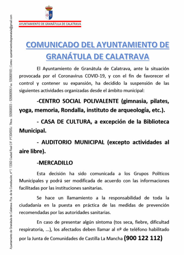 El Ayuntamiento de Granátula de Calatrava, ante la situación provocada por el Coronavirus COVID-19, y con el fin de favorecer el control y contener su expansión, ha decidido la suspensión de las siguientes actividades organizadas desde el ámbito municipal:
